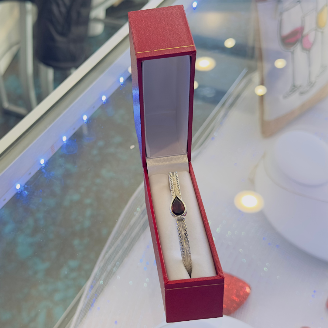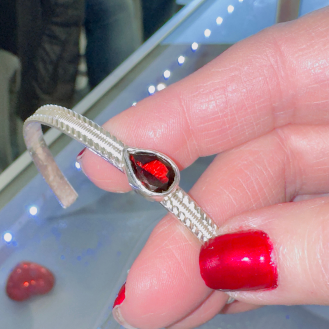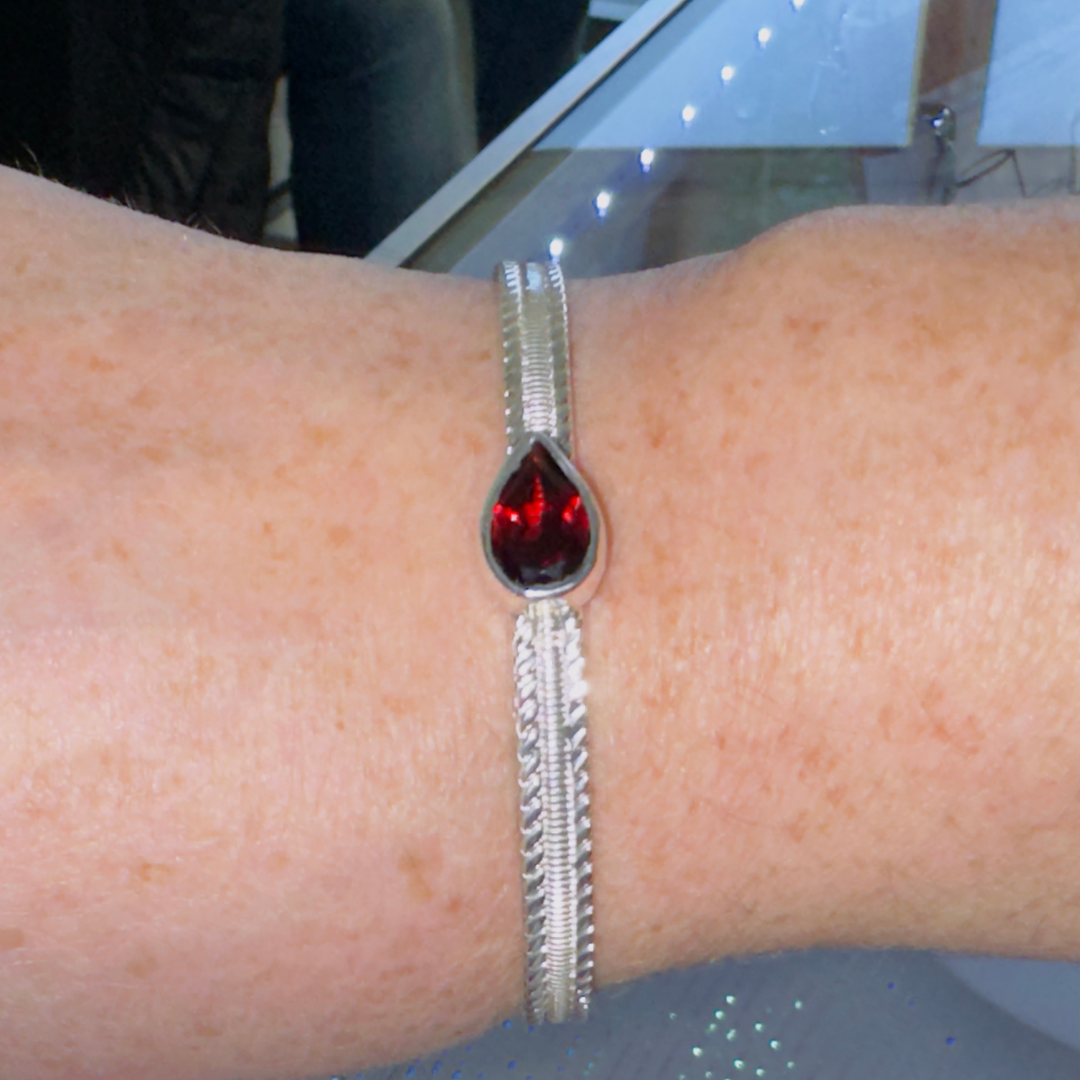Discover timeless elegance with this pear-shaped Garnet & .925 Sterling Silver Bracelet. Crafted from authentic sterling silver, this cuff bracelet showcases a stunning deep red garnet stone, a gemstone treasured for millennia.